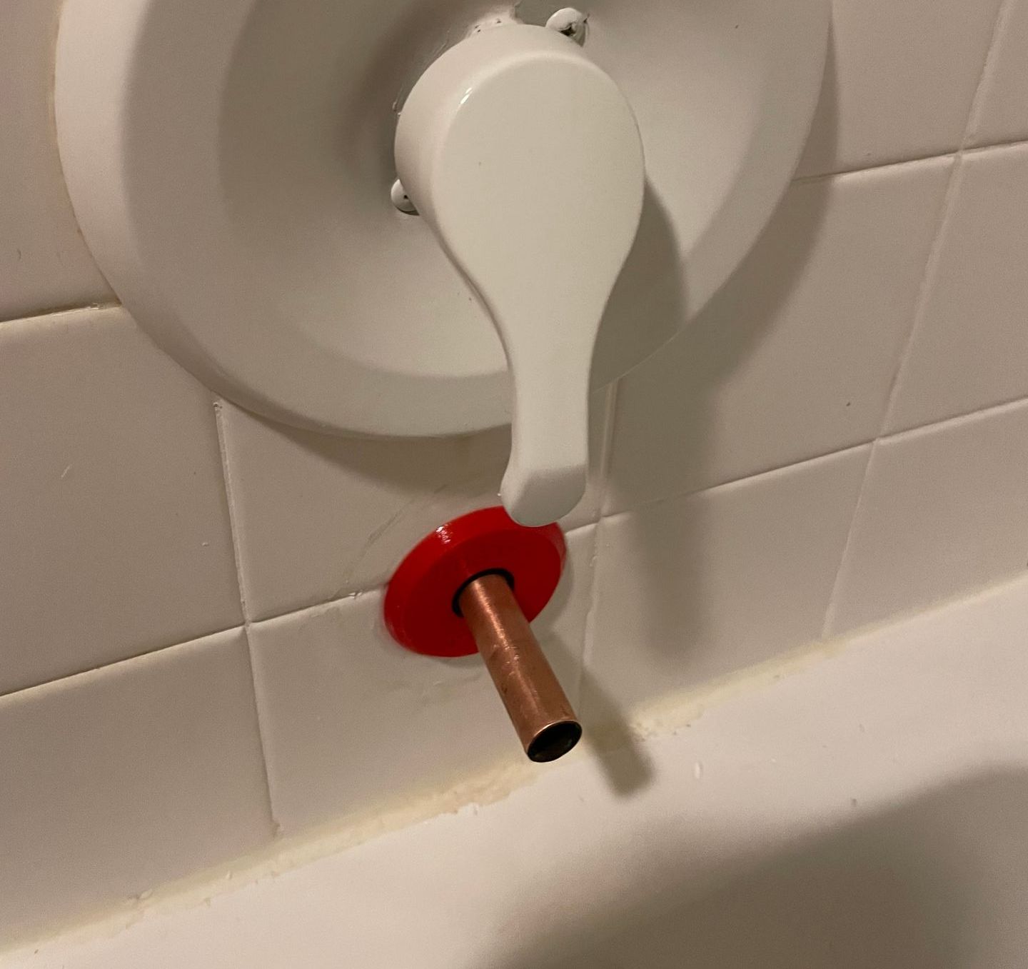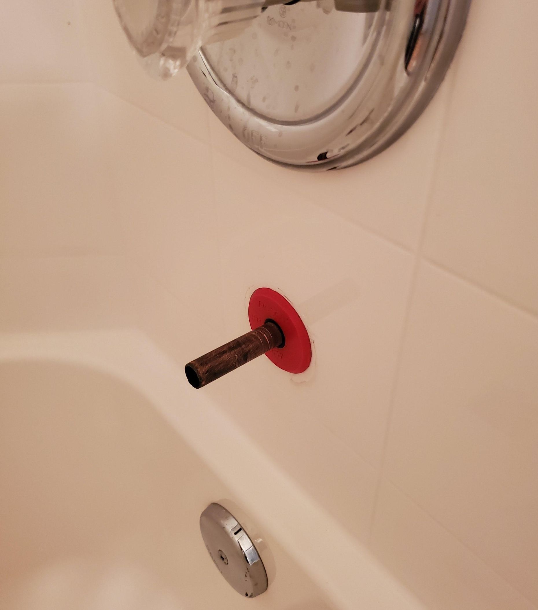David F. Says "I ran across this product elsewhere online (not Amazon) back in 2021. I always thought something like this was needed to properly seal tub spout cutouts below showers, so I ordered a pair to try out. Installation was easy, and I was very happy with the result. Sorry you can't see the red disk in my photo, but it's there behind the spout quietly doing its job. I highly recommend these."